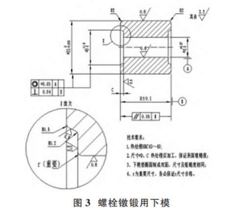 (3)預(yù)防措施。如圖 3 (同上)所示,該類失效的有效控制措施就是適當(dāng)加大并規(guī)范熱鍛下模 R0.5 圓弧過渡及圖中R0.2與R0.5之間的斜度。