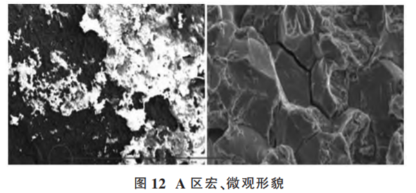 (2)原因分析。宏、微觀形貌。螺栓斷口宏觀形貌如圖11,斷口源區(qū) (A 區(qū))的宏、微觀形貌如圖12。