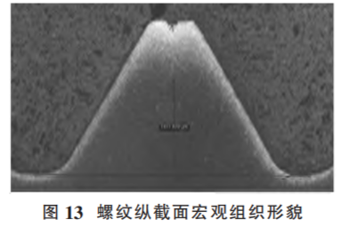 圖25為斷裂螺栓末端縱截面取樣位置及縱截面宏觀形 貌,可見在距離末端第 3 扣螺紋對應(yīng)位置內(nèi)部存在橫向裂紋。