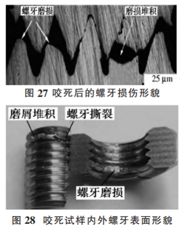 快速預(yù)緊和快速拆卸引起的螺牙間高溫導(dǎo)致不銹鋼螺牙表面發(fā)生嚴重黏著磨損;黏著磨損產(chǎn)生的磨屑在螺牙間堆積,阻礙了螺牙的旋合過程并最終引起咬死。