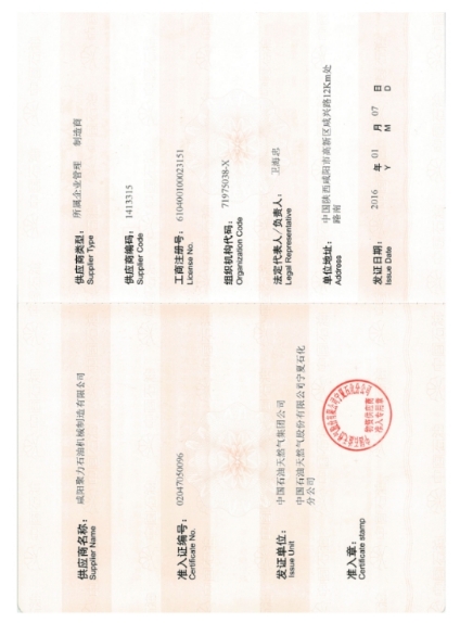 咸陽聚力石油機械制造有限公司的中國石油天然氣公司物資供應商準入證